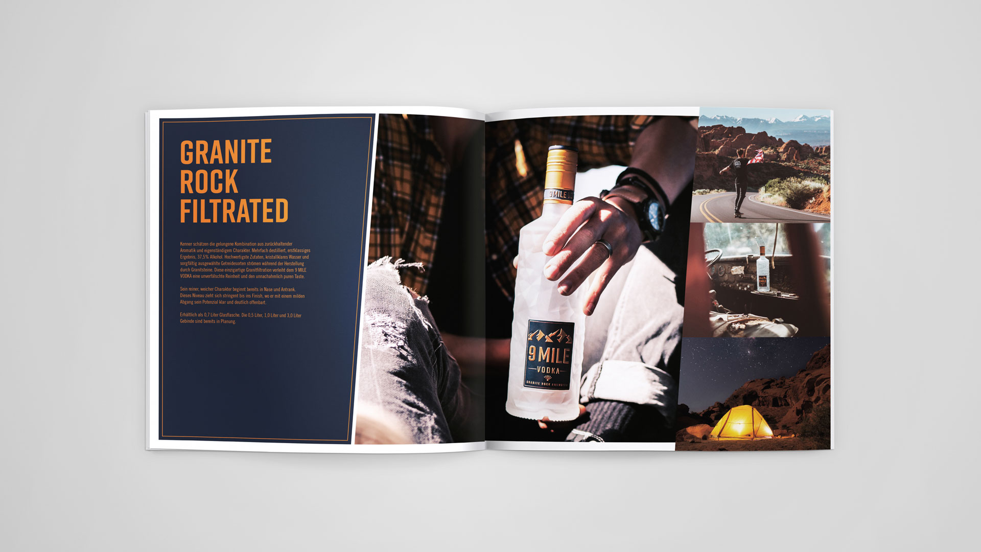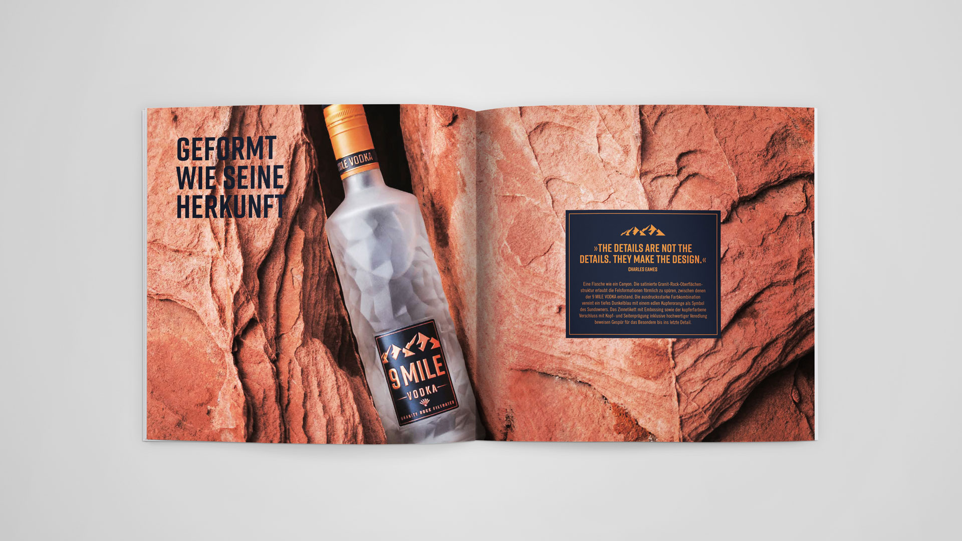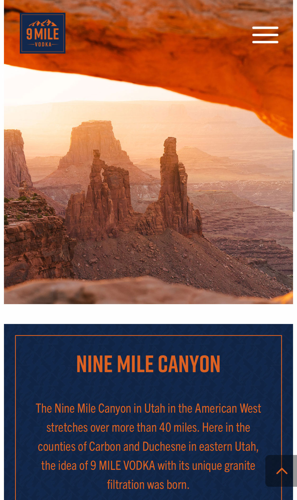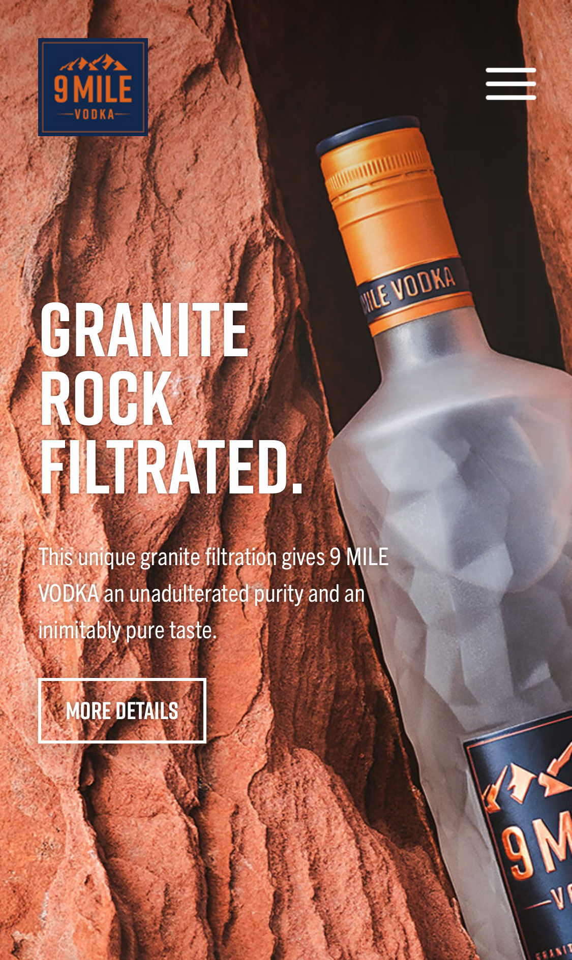 9 MILE Vodka ist besonders mild im Geschmack und wird mit hochwertigsten Zutaten hergestellt. Ein Road Trip durch den mittleren Westen der USA diente als Inspiration für die Geburtsstunde der Marke. Das Packaging ist eine Hommage an den atemberaubenden Nine Mile Canyon in Utah. Bei der Herstellung durchströmt der 9 MILE Vodka die rosa marmorierten Granitsteine und offenbart so seinen unverwechselbaren, unverfälschten und glasklaren Taste.