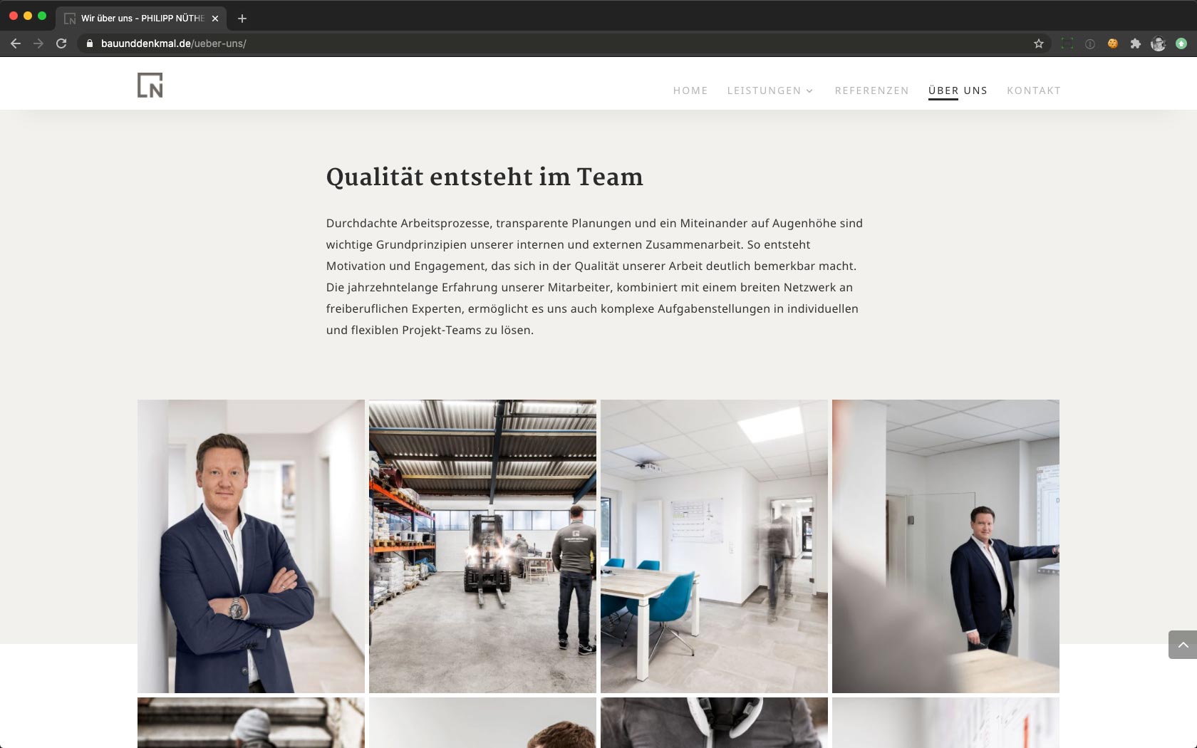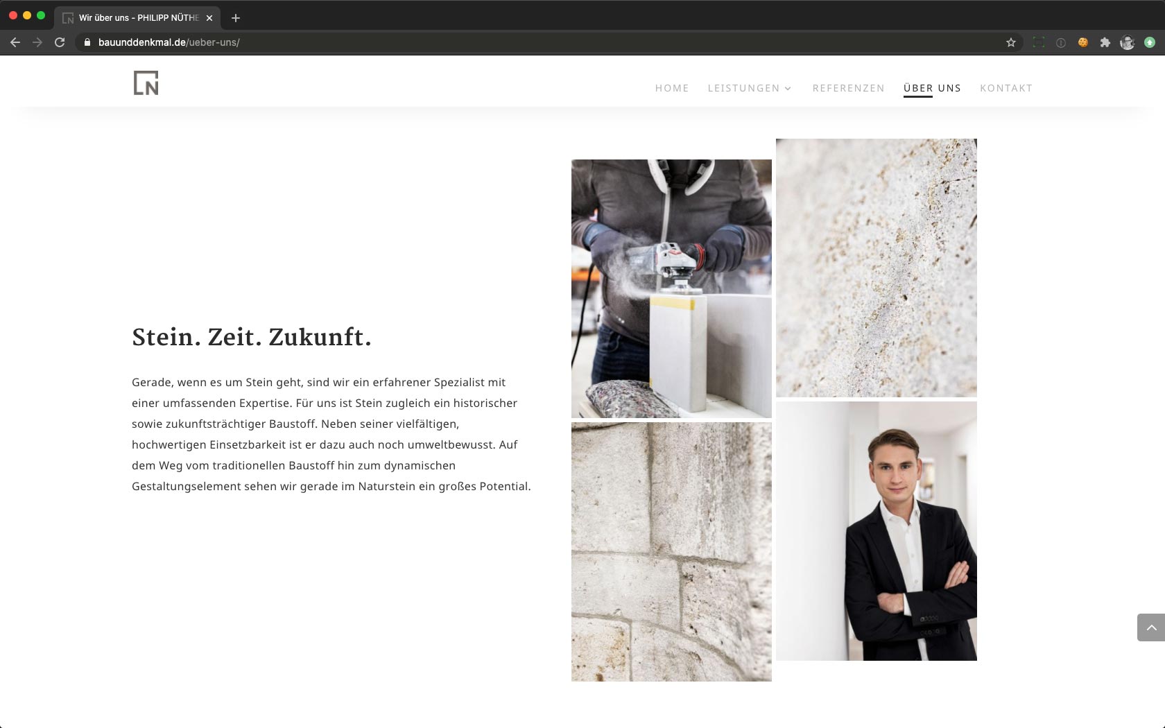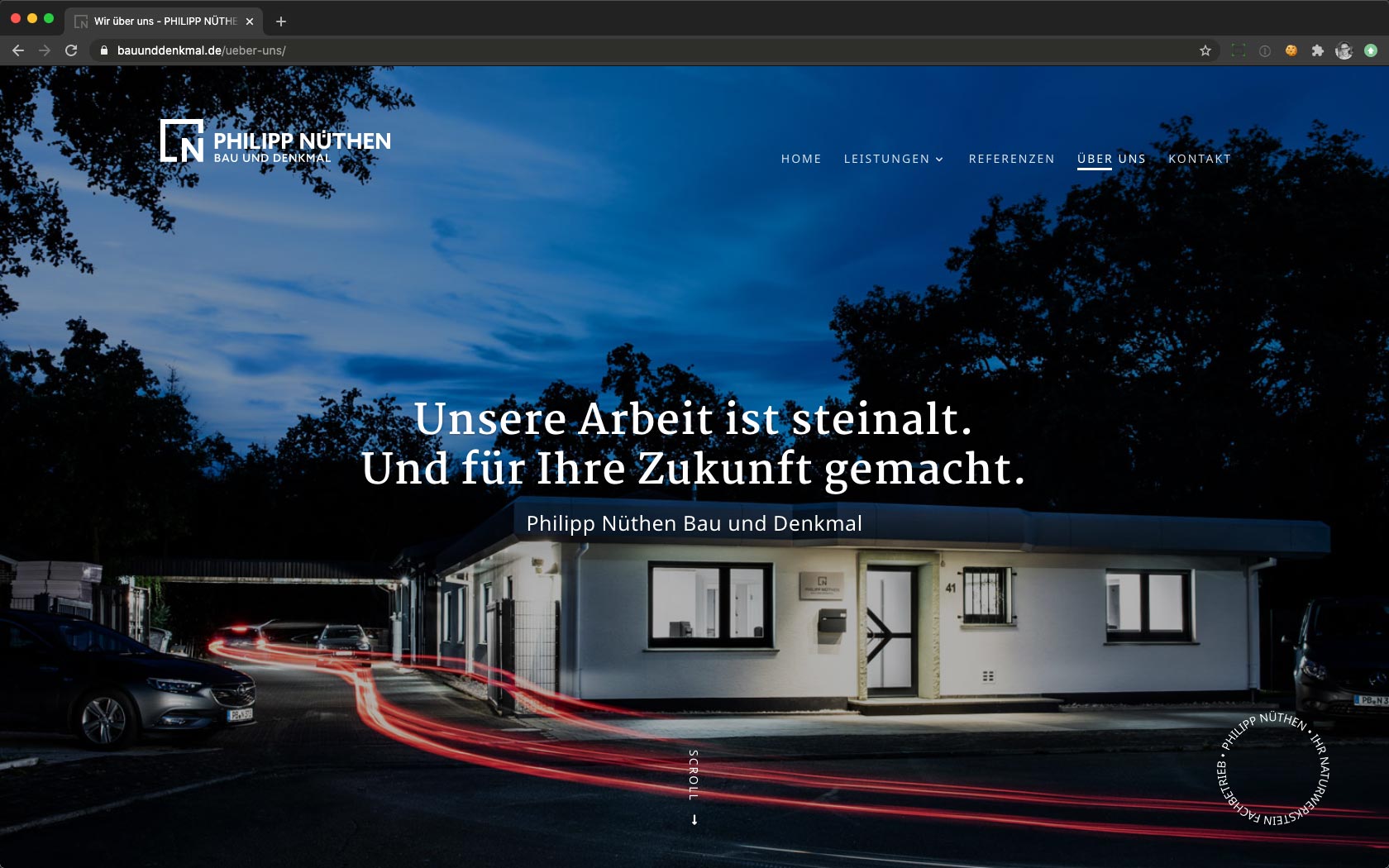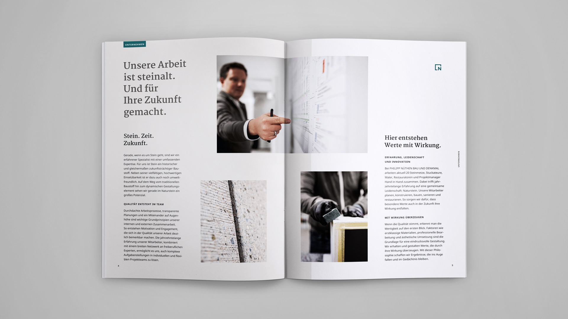 Leistungen Strategie, Markenstory, Markenentwicklung, Kommunikationskonzept, Limbic-Beratung, Designsystem, Bildwelt, Sprachstil, Text, Geschäftspapiere, Imagebroschüre, Anzeigen, Website, Außenwerbung Kunde PHILIPP NÜTHEN Bau und Denkmal GmbH & Co. KG