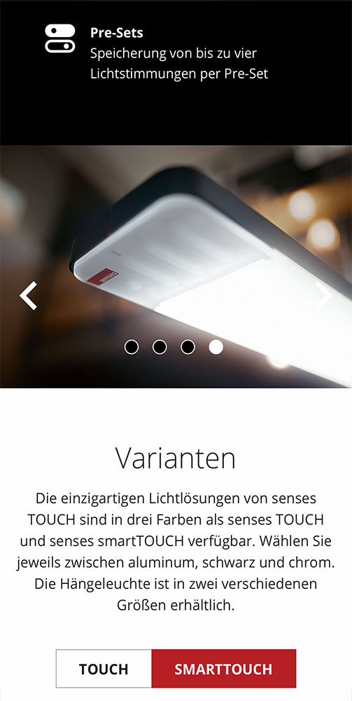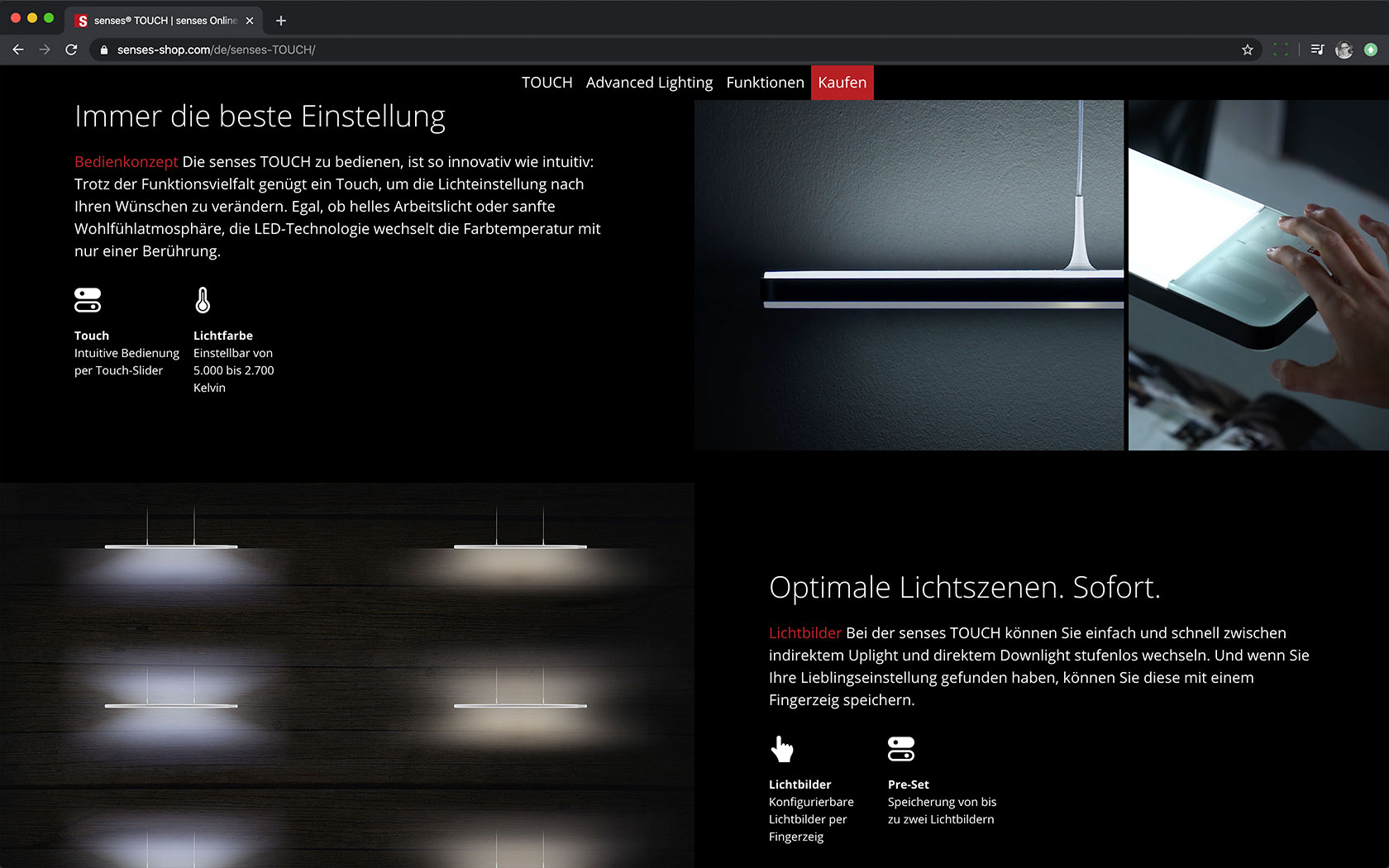 senses® vereint intelligentes Licht, ausgezeichnetes Design, innovative Steuerung und neuartige Technologie. Für die Kommunikation der Marke haben wir mit dem Begriff „Advanced Lighting“ eine neue Kategorie geschaffen, um die einzigartigen Vorzüge der Marke differenziert kommunizieren zu können. Mit Fokus auf den Limbic-Type „Performer“, wurde von uns eine neue Markenwelt konzipiert und unterschiedliche klassische sowie digitale Kommunikationsmittel umgesetzt.